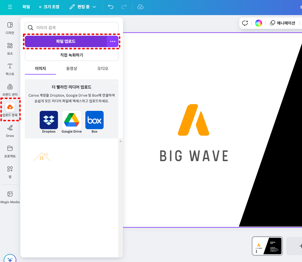 - 좌측 ‘업로드’ 메뉴 클릭 → ‘파일 업로드’에서 준비된 로고 파일을 불러옵니다.