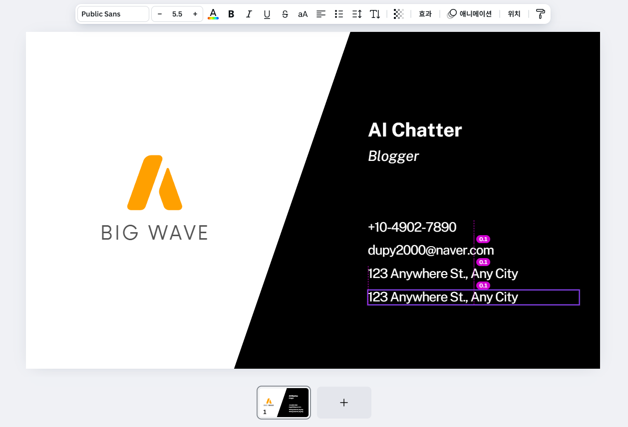 - 템플릿 내의 텍스트를 클릭해 이름, 연락처, 이메일, 소셜 미디어 정보 등을 입력합니다.